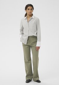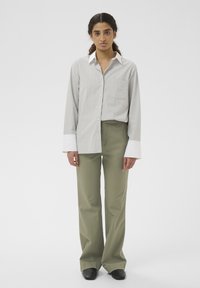 Personne portant un pantalon large de couleur olive, des chaussures noires à bout carré, et une chemise à manches longues gris clair avec des poignets blancs, debout devant un fond blanc.