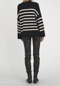 Pull large rayures noires et blanches à manches longues, associé à un pantalon en cuir noir sur une personne debout.