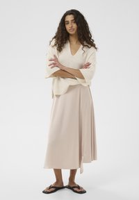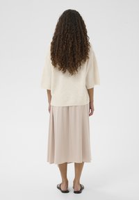 Jeune femme aux longs cheveux bouclés portant un pull ample crème à larges manches et une jupe beige sur un fond uni.