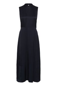 Robe midi sans manches en satin beige avec col drapé et détail subtil de couture diagonale sur le devant.