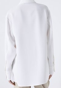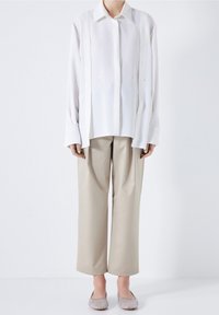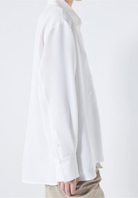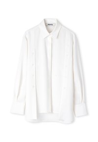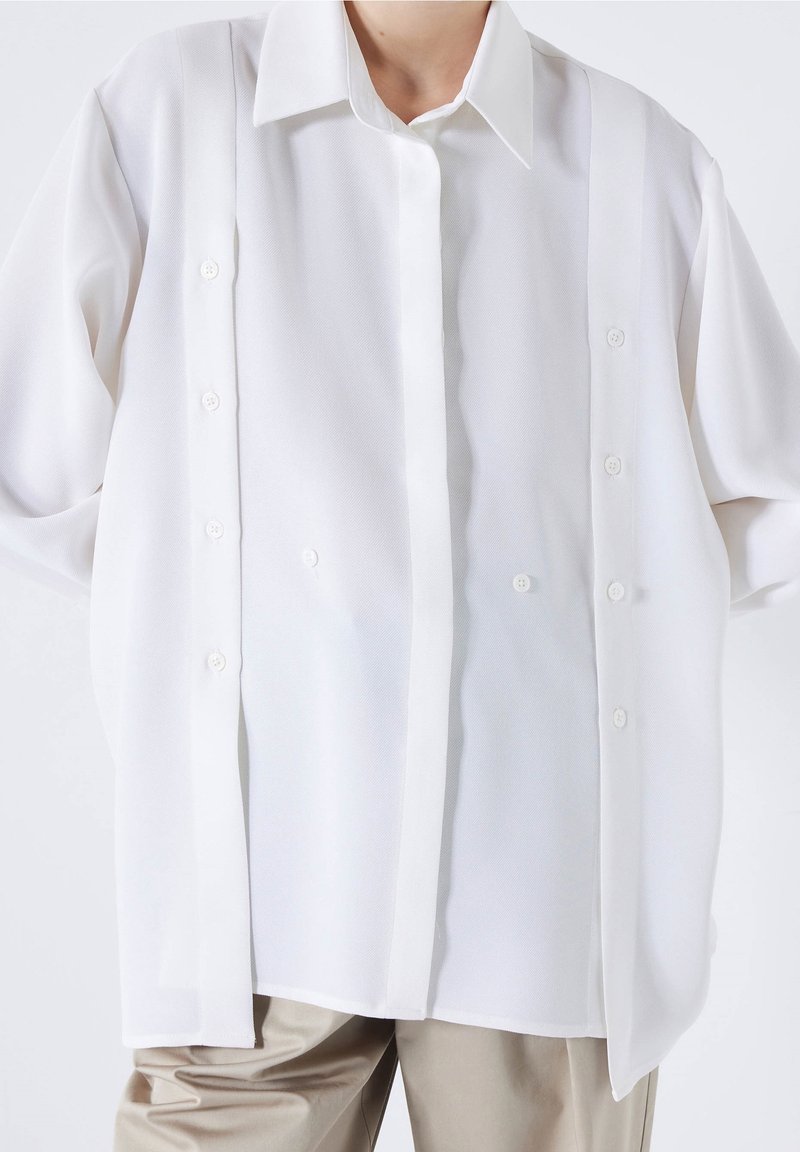 Chemise blanche boutonnée avec col, fabriquée en tissu léger. Comprend deux plis verticaux et six boutons sur le devant.