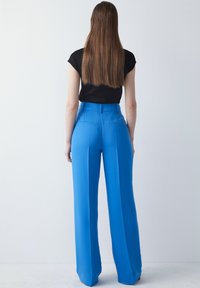 Pantalon large bleu en tissu lisse, présentant un pli devant et une taille ceinturée. Associé à un haut noir ajusté.