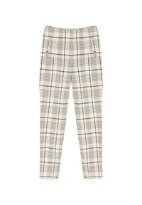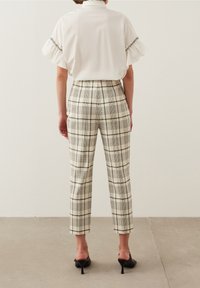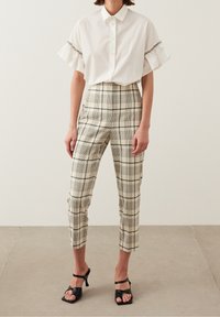 Chemise blanche à manches évasées, associée à un pantalon taille haute à carreaux beiges et des sandales à talons avec lanières noires.