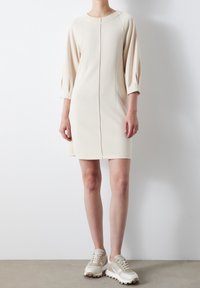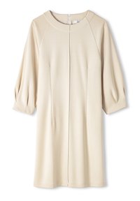 Robe beige en tissu doux, avec manches trois-quarts, col rond et plis devant pour marquer la silhouette. Design simple et épuré.