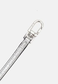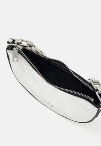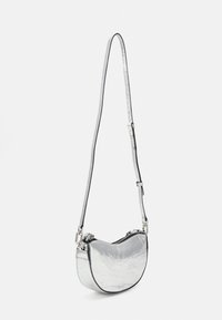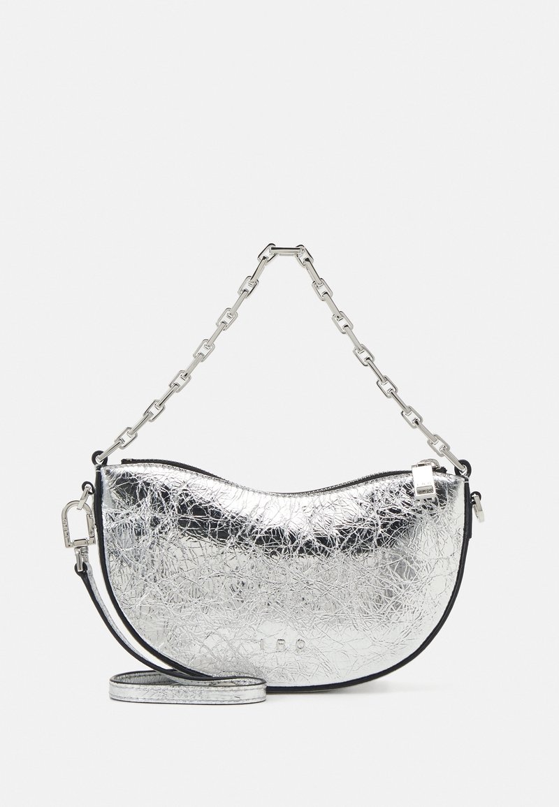 Sac à main en forme de croissant métallique argenté avec une surface texturée, une poignée chaîne et une bandoulière amovible sur un fond uni.