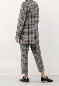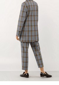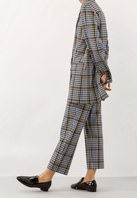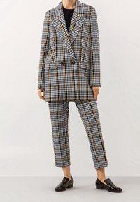Blazer oversize à carreaux noir, blanc et moutarde avec fermeture à double boutonnage ; pantalon assorti sur mesure et mocassins noirs brillants.