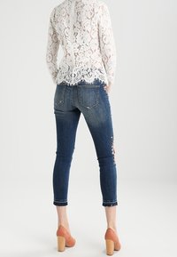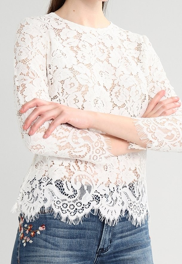Top en dentelle blanche avec des motifs floraux, manches longues et détails à franges au bas. Porté par-dessus un jean bleu avec broderies florales.