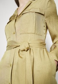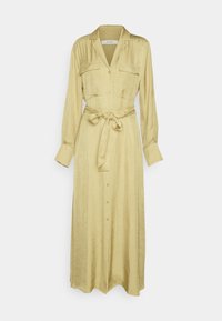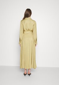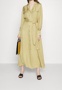 Robe longue couleur olive, en tissu lisse, dotée de deux poches avant, d'une taille ceinturée et d'une boutonnière. Associée à des sandales glissantes noires.