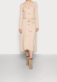 Robe midi beige côtelée avec un décolleté en V, manches longues, boutons sur le devant et ceinture à la taille. Portée avec des bottines marron clair ornées d'une lanière marron.