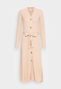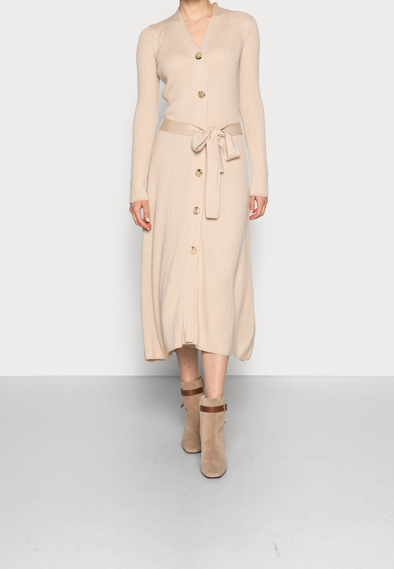 Robe beige à boutons avec des manches longues, des épaules structurées et une ceinture nouée. Présente un panneau d'épaule texturé et des boutons ton bois.