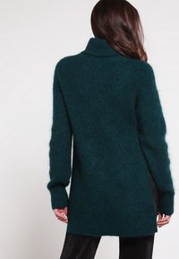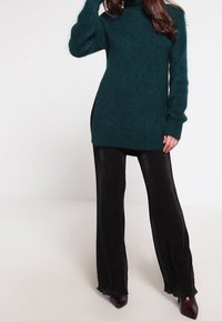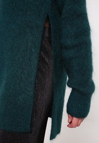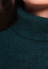 Personne portant un pull à col roulé duveteux vert foncé et un pantalon foncé, les mains partiellement couvrant le visage sur un fond uni.