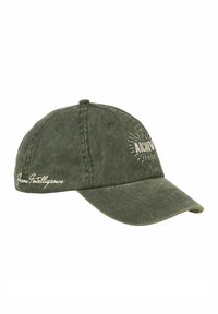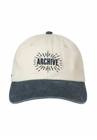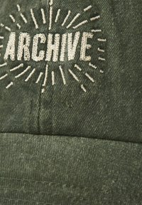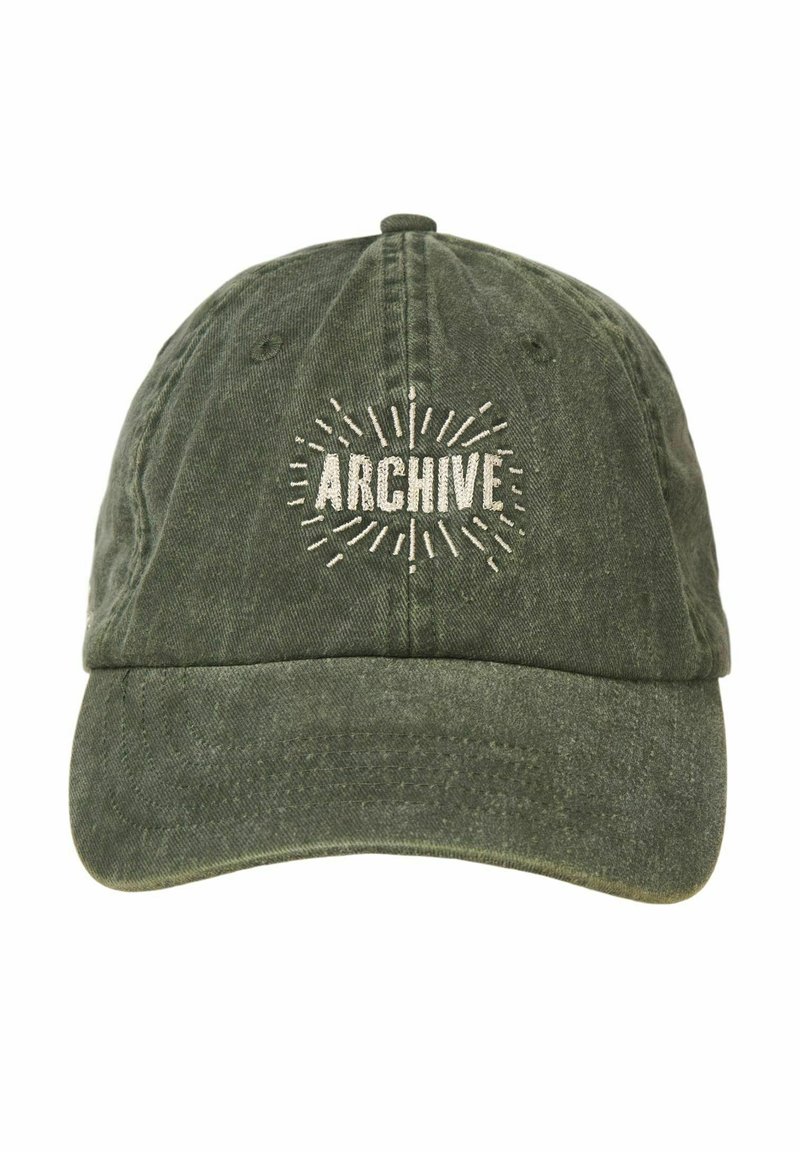 Casquette de baseball en coton vert avec une visière incurvée et un logo brodé « ARCHIVE » entouré de rayons. Comprend des détails cousus et une sangle réglable.