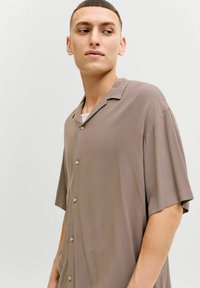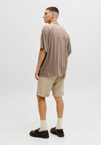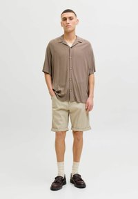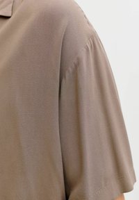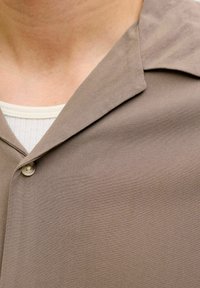 Jeune homme regardant vers la gauche, portant une chemise à manches courtes marron clair ample boutonnée et un pantalon beige clair sur un fond uni.
