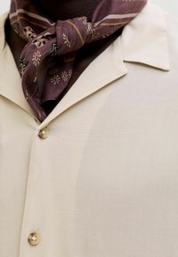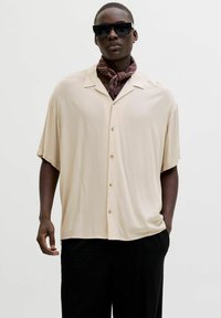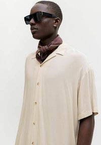 Homme portant une chemise beige à manches courtes surdimensionnée boutonnée, un pantalon noir, des lunettes de soleil foncées, et une écharpe à motifs nouée autour du cou.