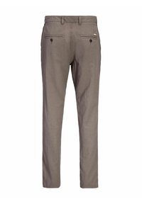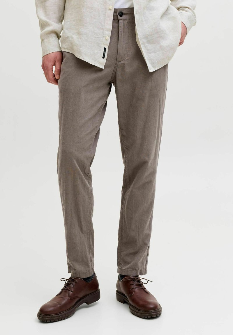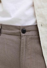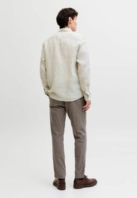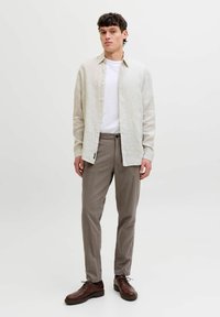 Homme portant un pantalon droit taupe, des chaussures en cuir marron à lacets, et une chemise beige clair boutonnée, une main dans la poche.