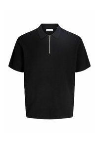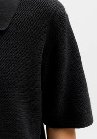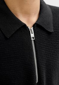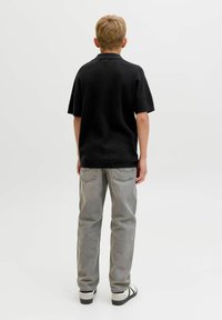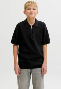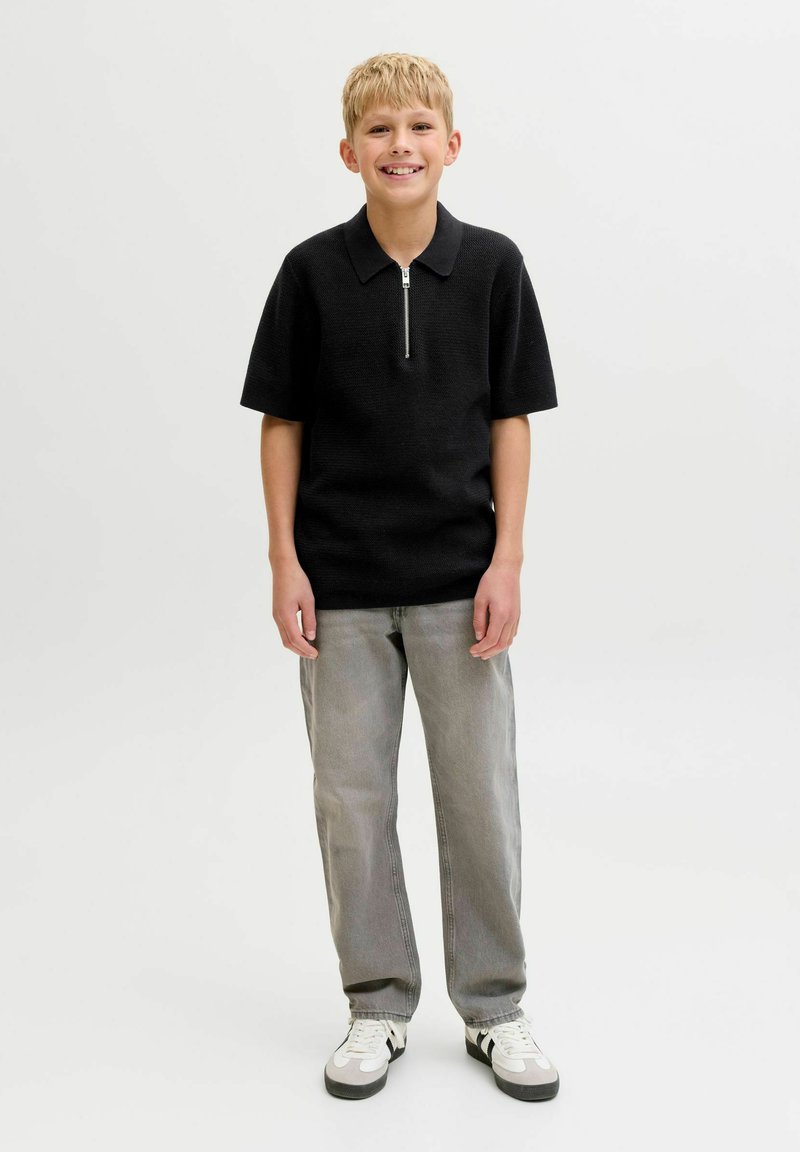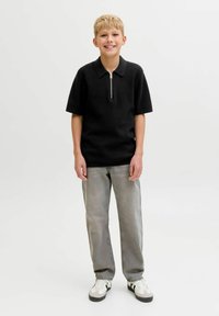 Garçon souriant debout, portant un polo à manches courtes noir, un jean gris et des baskets blanches, sur un fond clair uni.