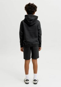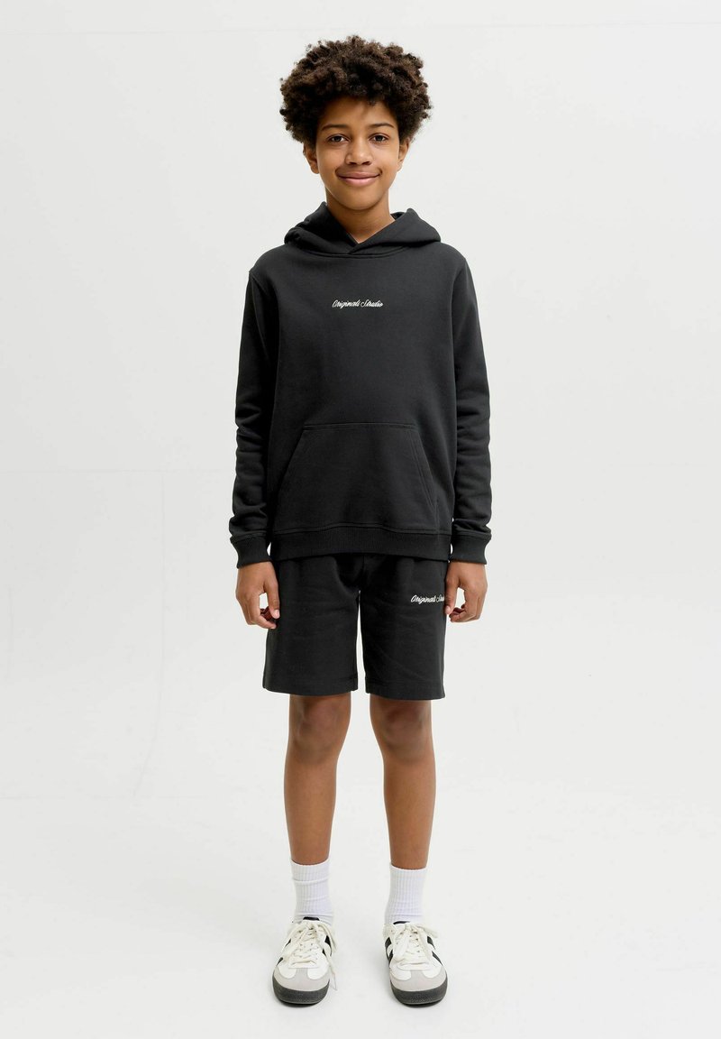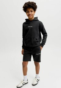 Garçon aux cheveux bouclés portant un sweat à capuche noir et un short avec un texte blanc, des chaussettes blanches et des baskets, debout devant un fond clair.