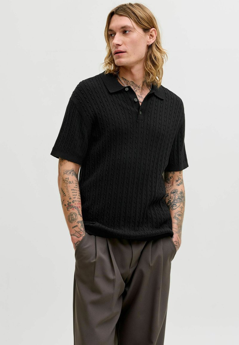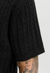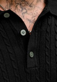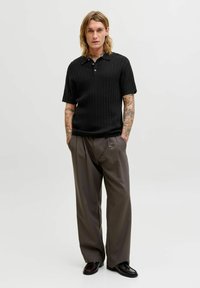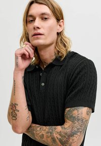 Homme aux cheveux mi-longs et tatouages, portant un polo noir en tricot à manches courtes et un pantalon marron ample, debout les mains dans les poches.