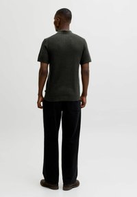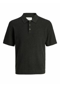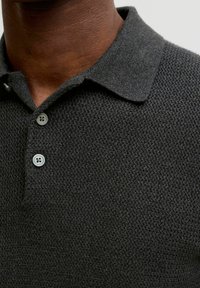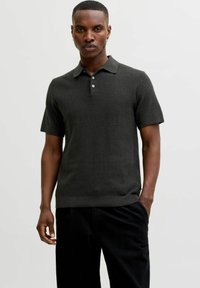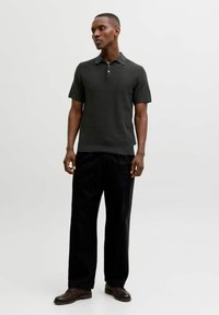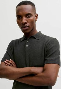 Homme aux cheveux courts et portant des boucles d'oreilles, habillé d'un polo en maille manches courtes gris foncé et d'un pantalon noir, sur un fond uni.