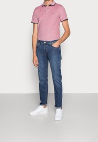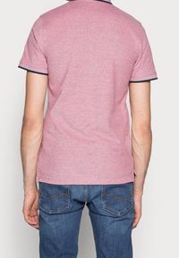 Polo shirt rouge et marine avec une texture heather subtile, patte de boutonnage à deux boutons et bordure marine au col et aux manches, associé à un jeans bleu.