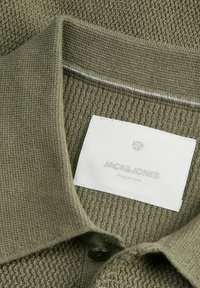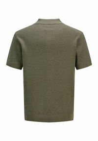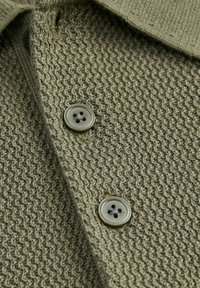 Polo tricoté vert olive à manches courtes avec patte de boutonnage à deux boutons, ourlet et poignets côtelés.