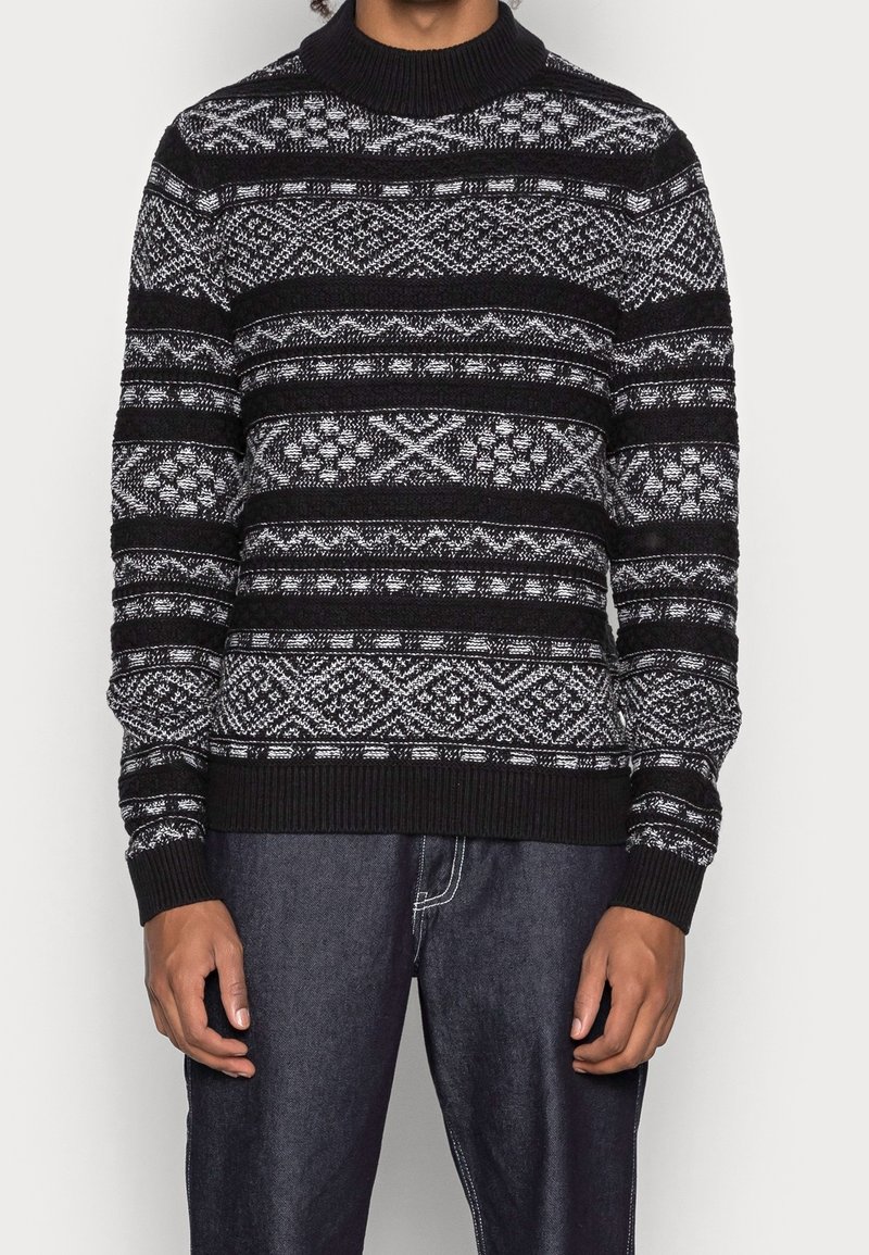 Homme portant un pull en tricot noir et blanc avec des motifs géométriques, associé à un jean bleu foncé, debout devant un fond uni.