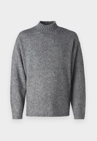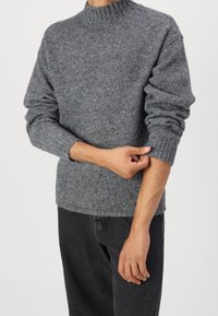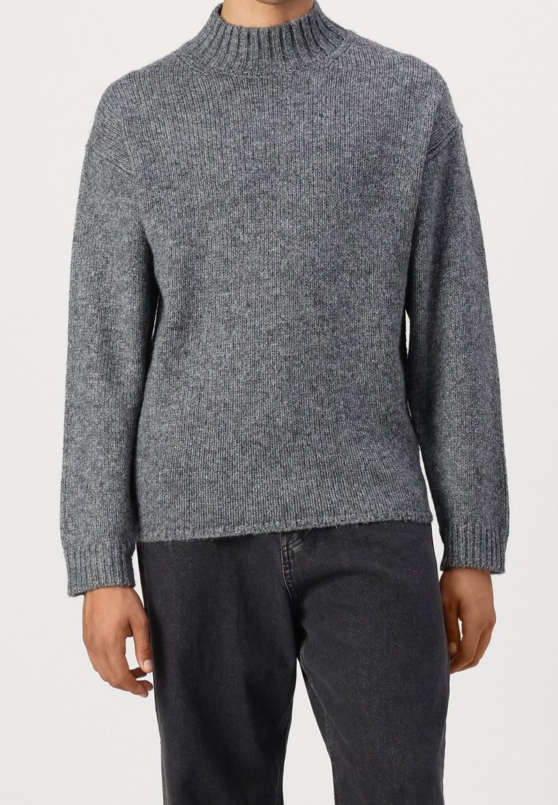 Pull gris en maille avec un col montant et des manches longues. Présente une texture côtelée, un ourlet droit et une coupe décontractée. À porter avec un jean foncé.