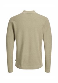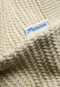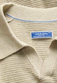 Pull beige avec col en V et col court, présentant un motif en maille texturée, manches longues, et poignets et ourlet côtelés.