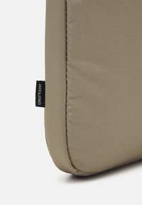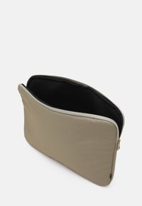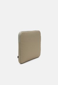 Housse d'ordinateur portable rectangulaire beige rembourrée avec coins arrondis et petite languette de fermeture éclair noire sur fond blanc.