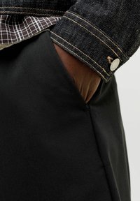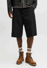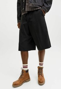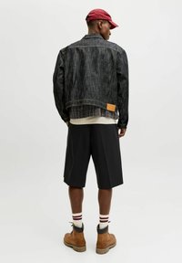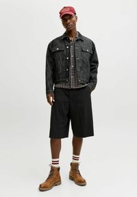 Homme portant un short noir longueur genou, des bottes montantes marron à lacets, des chaussettes blanches avec deux bandes rouges, associé à une chemise à carreaux et une veste en jean.