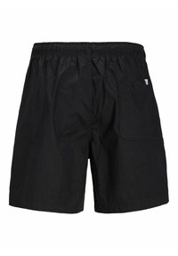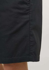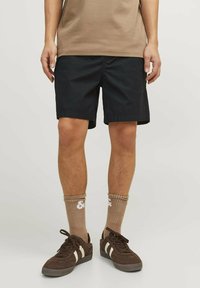 Shorts noirs à coupe droite, portés avec des chaussettes texturées marron et des baskets à lacets marron avec des accents clairs. Design simple et fonctionnel.