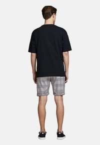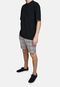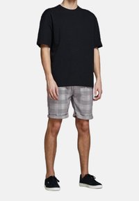 Homme portant un t-shirt noir oversize, un short à carreaux gris avec des ourlets repliés, et des baskets noires avec des semelles blanches, se tenant devant un fond uni.