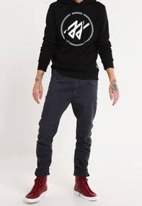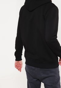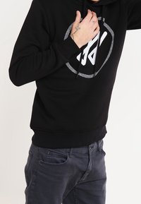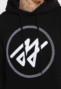 Sweat à capuche noir avec un logo circulaire blanc sur la poitrine, doté d'une capuche à cordon de serrage et de poignets côtelés, associé à un jean gris foncé.