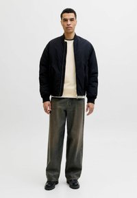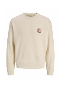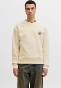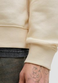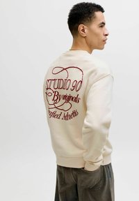 Homme de dos portant un sweat-shirt crème avec un script rouge « STUDIO 90 By originals Crafted Aesthetics » et un jean noir délavé.