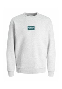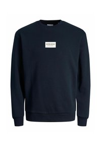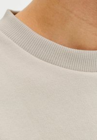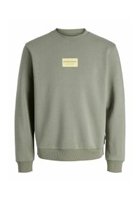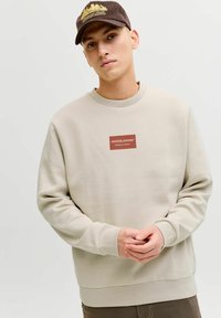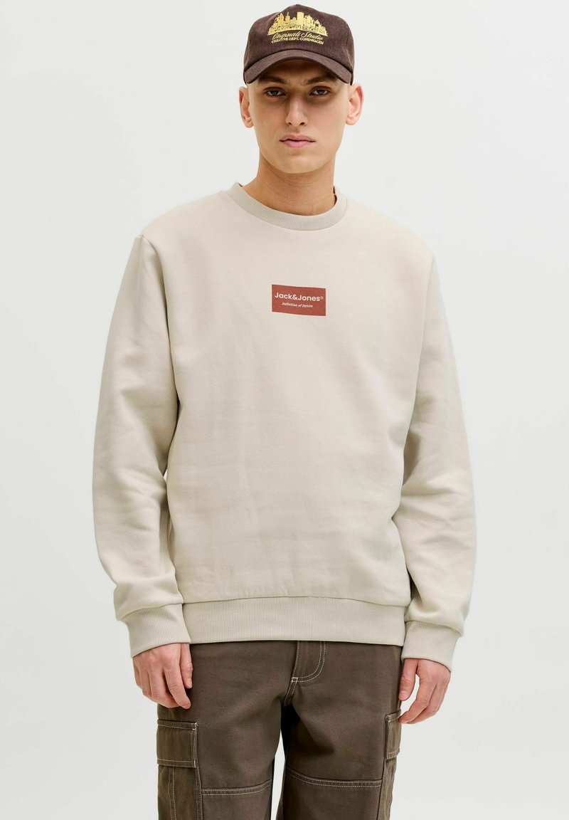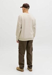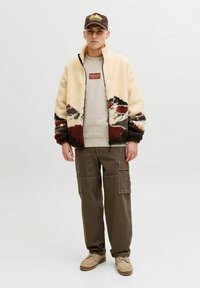 Jeune homme portant un sweat-shirt beige Jack & Jones, un pantalon cargo marron foncé et une casquette marron avec un motif de paysage urbain jaune.