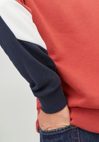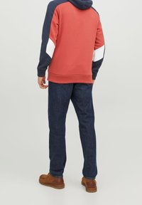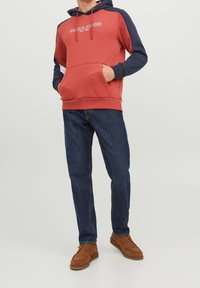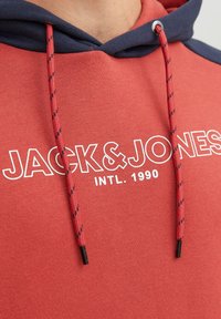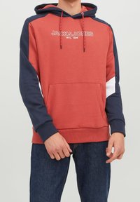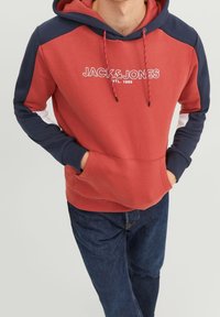 Sweat à capuche rouge et marine avec une poche kangourou, des poignets côtelés, une capuche avec cordon de serrage et un logo graphique sur la poitrine. Mélange de coton, design décontracté.