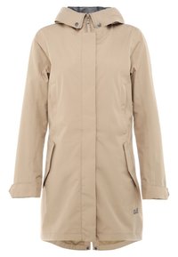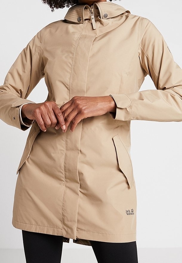 Imperméable beige à capuche avec fermeture éclair et boutons-pression, poches à rabat à l'avant, porté par une personne les mains jointes à la taille.