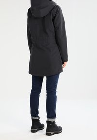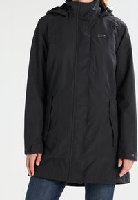Veste isolante noire avec un col montant, des détails de couture subtils et le logo Jack Wolfskin brodé sur la poitrine.