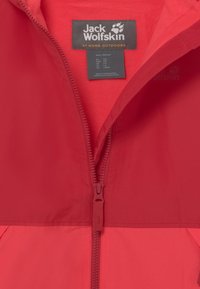 Veste imperméable rouge avec capuche, comportant une partie supérieure rouge foncé et une partie inférieure rouge clair, des poches avant et des poignets élastiques.