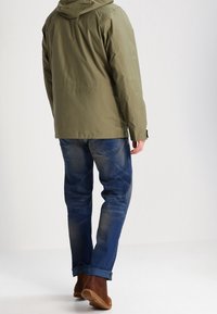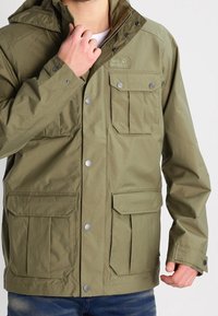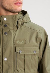 Homme portant une veste Jack Wolfskin vert olive avec plusieurs poches frontales et des boutons-pression, ajustant le col.