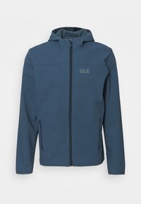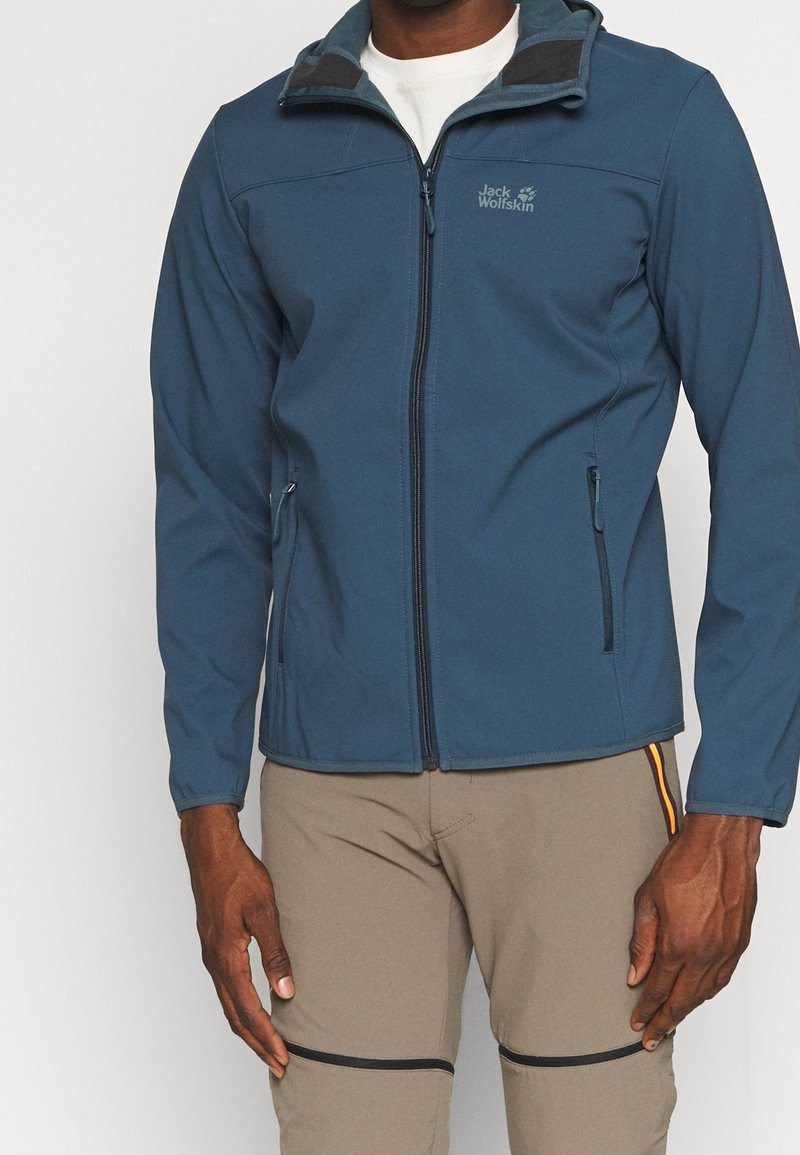 Veste softshell bleue avec fermeture éclair à l'avant, deux poches latérales, un col montant et des poignets contrastés. Logo de la marque sur la poitrine.