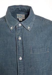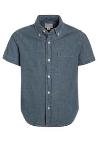 Chemise en chambray bleu à manches courtes avec un col boutonné, une poche avant et des boutons blancs. Texture lisse, ourlet arrondi.