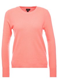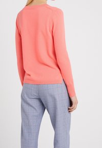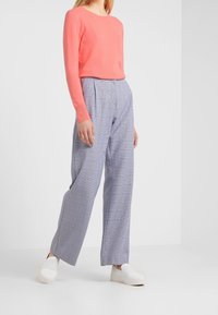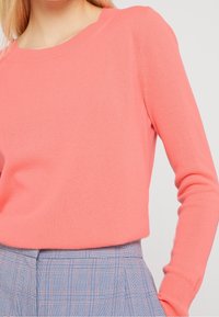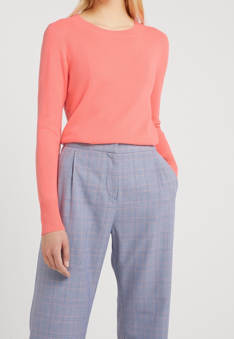 Pull corail en mélange de laine avec un col rond, associé à un pantalon à carreaux bleu clair avec des accents rouges subtils et des détails plissés.