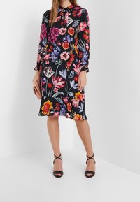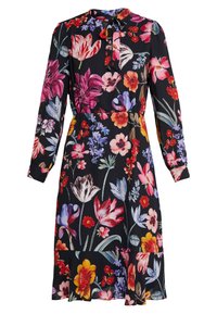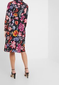 Robe noire longueur genou avec manches longues et grands motifs floraux multicolores vibrants, ornée d'un petit nœud au niveau de l'encolure.