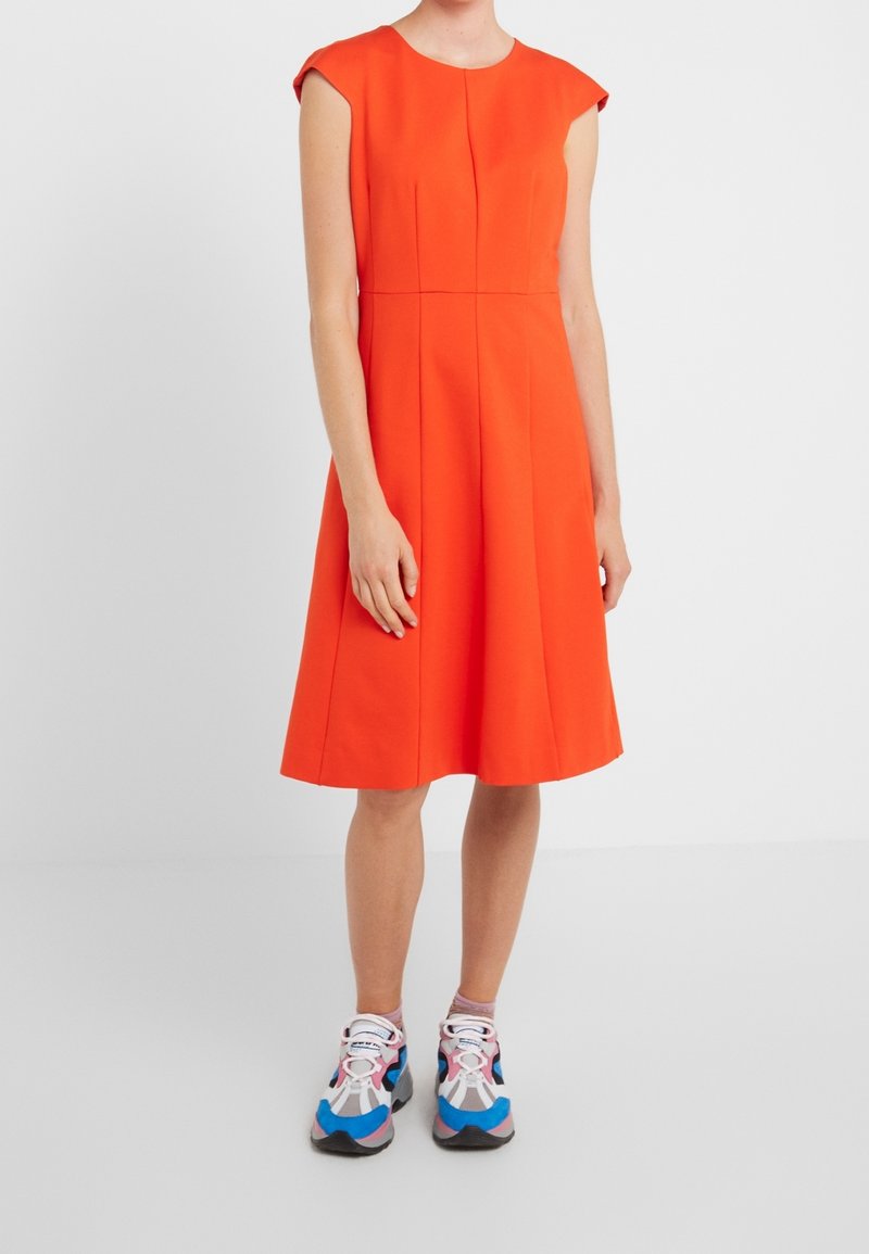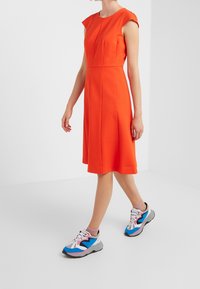 Femme portant une robe sans manches orange vif arrivant au genou, associée à des baskets colorées à semelles épaisses, debout devant un fond blanc uni.