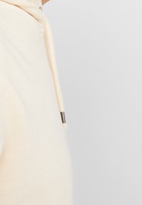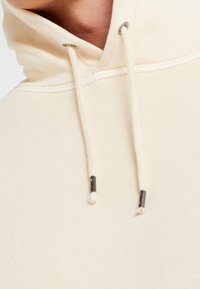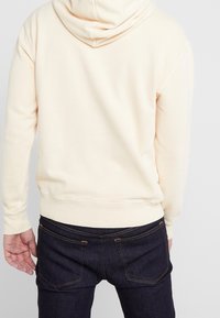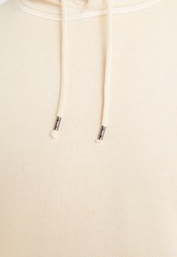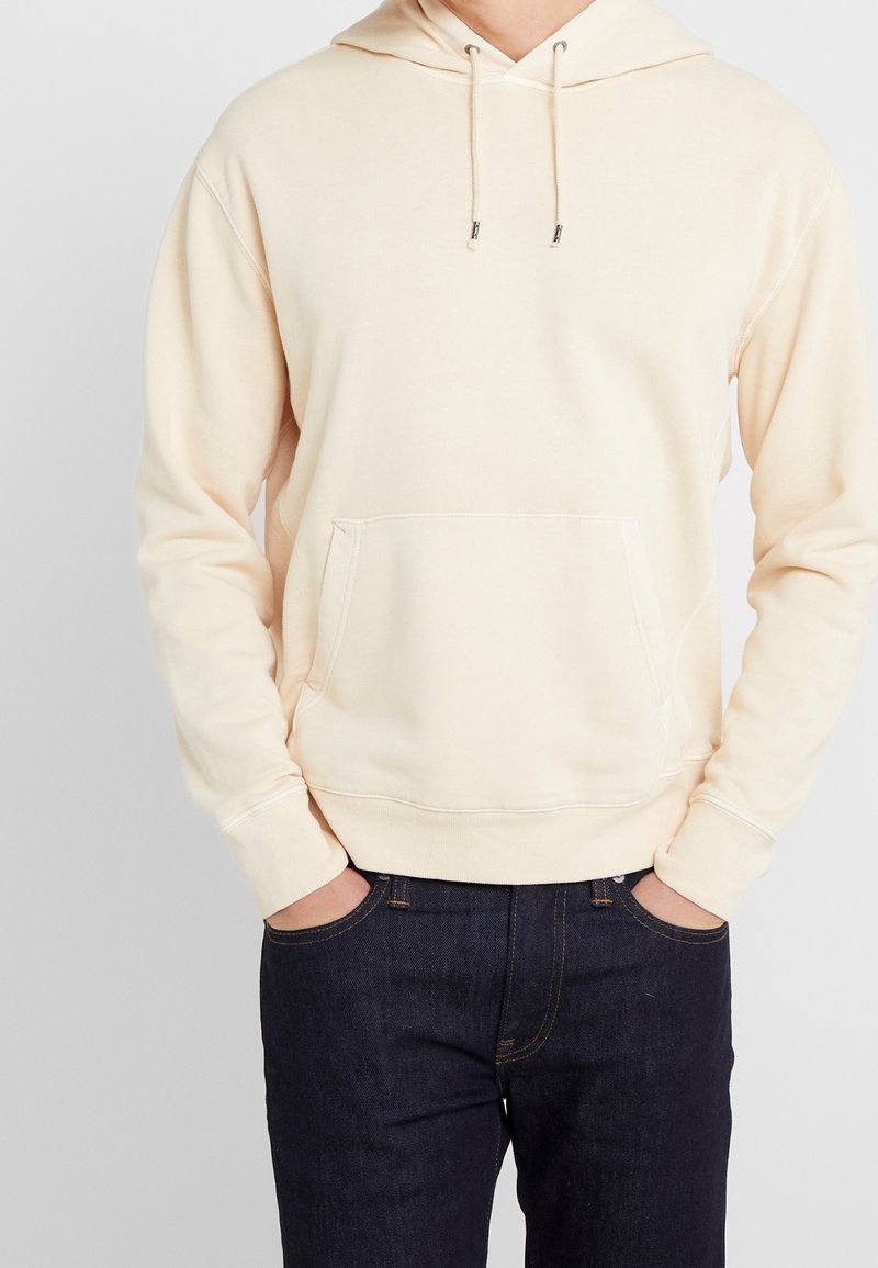 Homme portant un sweat à capuche beige clair avec poche avant et cordons, associé à un jean bleu foncé, les mains dans les poches.