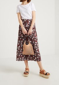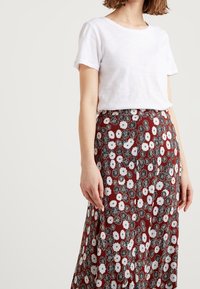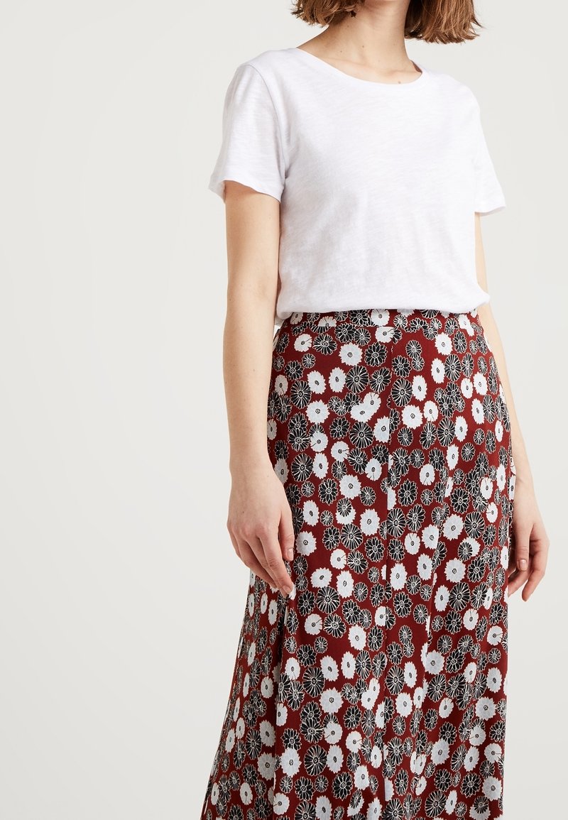 Femme portant un t-shirt blanc uni à manches courtes rentré dans une jupe rouge à motif floral blanc et noir.