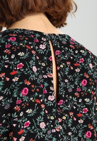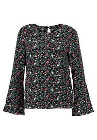 Blouse noire à manches longues avec un motif floral en rose, rouge et vert. Confectionnée dans un tissu doux avec un col rond et des manches évasées.