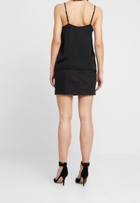 Femme portant un caraco noir bordé de dentelle, rentré dans une mini-jupe noire en similicuir avec une fermeture éclair à l'avant et des poches zippées.