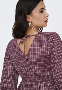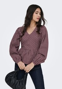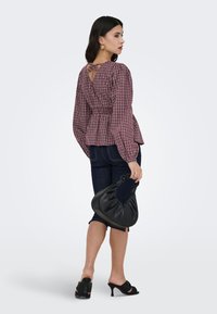 Femme aux longs cheveux foncés portant un chemisier à manches longues à carreaux bordeaux et un jean foncé, tenant un sac à main noir dans sa main gauche.